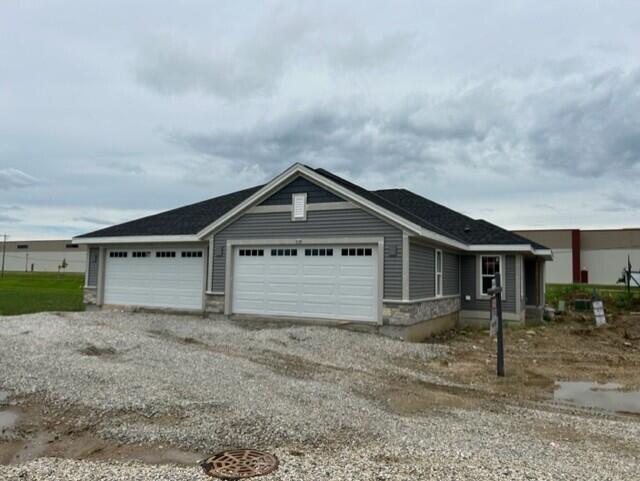 UNDER CONSTRUCTION. Rough completion November/December. Located 12 minutes off I-94, this comfortable open-concept side-by-side, ranch, split 2-bedroom condominium home features a universal design for ease of living. The kitchen has quartz counters, s.s. appliances, WIP, island w/ seating & dining area. The gathering room has a GFP w/ stone to mantel height, coffered ceiling & patio door leading out to a private patio. The primary bedroom w/ its WIC & private bathroom features a dual vanity w/ quartz counters & 5-ft shower which is located in the rear of the home while a spacious secondary bedroom & hall bath are located at the front. Home has egress window & is plumbed for future bath.