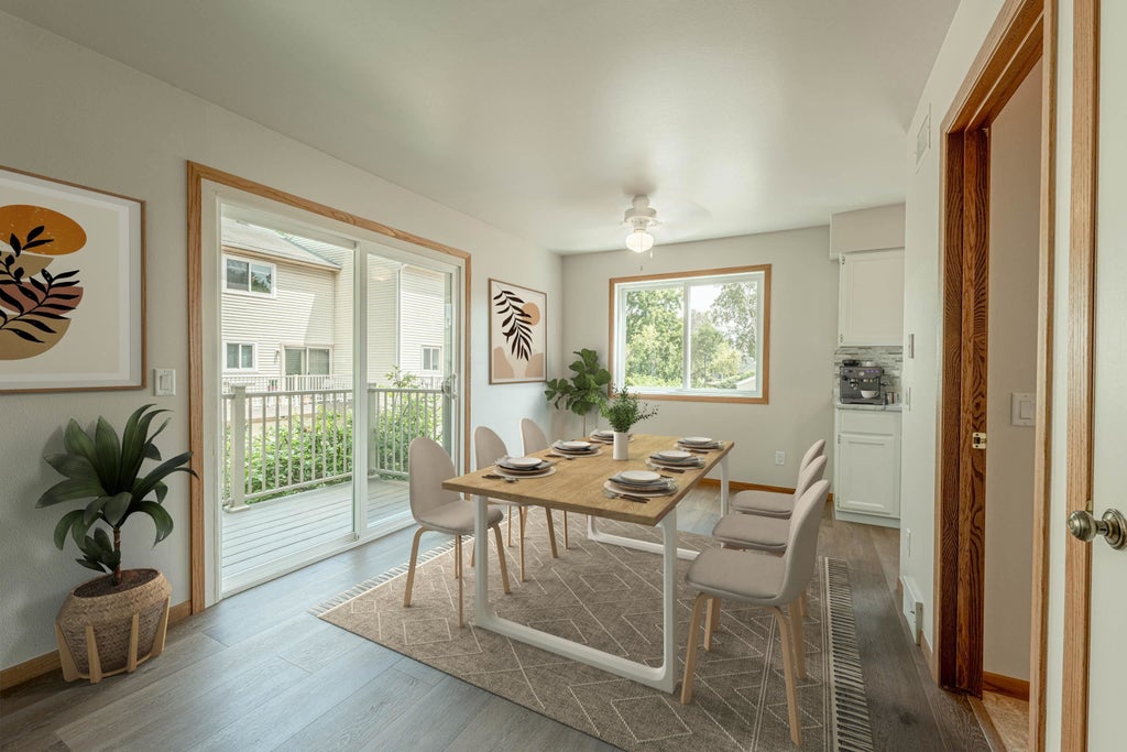 Bright, inviting, and freshly updated—this spacious condo is ready to welcome you home. Thoughtful renovations bring a modern, airy feel to the open layout, where sunlight pours into the living area with a fireplace that sets the tone for cozy evenings. The dining space opens to a private deck, ideal for savoring quiet mornings or relaxed evenings. Upstairs, two generous bedrooms with walk-in closets share a beautifully refreshed full bath. Enjoy in-unit laundry, a 2-car garage, and community green space, all moments from dining, shopping, and parks.