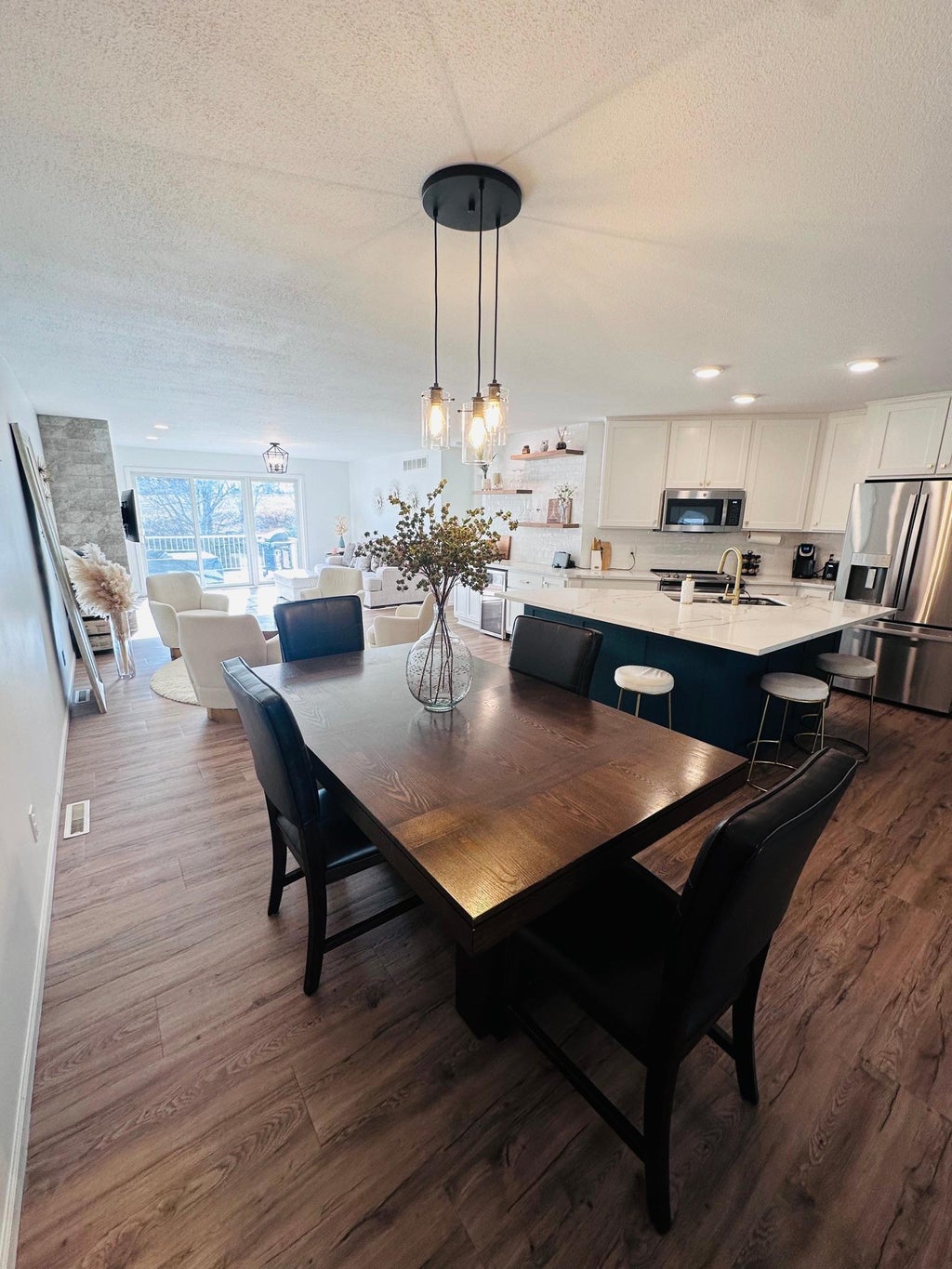 Fall in love with this modern Shardlow Townhome offering a great open floor plan with 3 bedrooms, 3 baths, and back deck! Inviting main entrance with new front door and accent window as walk into the spacious foyer to be greeted by a well designed and updated main floor that opens to the kitchen with large island, plenty of cabinet space and counter space, expansive dining space and a quaint social area that offers bar area with a wine cooler and flows right back into the living room showing stone surround gas fireplace with just steps away to the back deck. The primary suite offers southern exposure, updated 3/4 bath, & walk-in closet. There is also a spacious laundry room and 1/2 bath. The lower level has a new bar area showing built-in cabinets, quartz tops and flooring, a cozy but sizable great room, full bathroom, 2 large bedrooms with one that walks out to patio. There is plenty of storage throughout this stunning townhome that offers so many unique amenities throughout. A great location being steps away from Somerby golf course and just 10 miles to downtown Rochester.