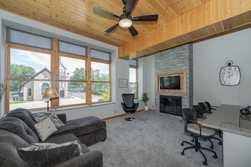 This unique unit features a relaxed setting with a cozy fireplace and natural lighting through the bank of windows lining the east side views. Put your feet up and watch the sunrise in the fully furnished unit. The extended living room offers a pocket door to separate the open concept living area. The extended living area can easily be a second bedroom or study. The custom kitchen is breathtaking with slate appliances, pantry, and appliance garage. The master bedroom features a custom mural on the wall by a local artist giving the bedroom spa-like atmosphere. The bathroom features a walk-in tile shower. Lanesboro is the gateway to the outdoors with the Root River and bike trail. The town is full of culture, art and theater.
