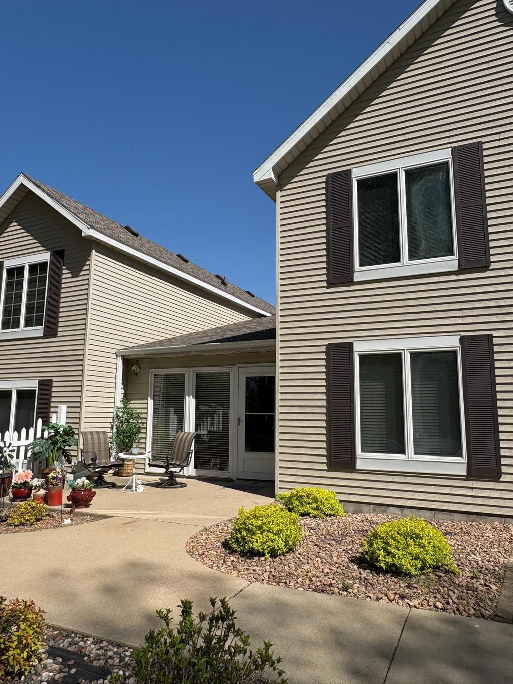 Simplicity with abundance of amenities! Convenient Broadway location provides easy access to parks, shopping, doctor's office(s), and downtown from this lovely townhome! 1 of 4 units in this small HOA, that feels like a cozy community. Primary bedroom suite on the main level. Open floor plan kitchen, dining, and living areas, flow right out to the front south facing patio. 2 additional bedrooms and 2nd bath complete the 2nd level. NEW chairlift is included! Main floor laundry room, and 2 storage closets right off the kitchen area. Vaulted ceiling & sky light make this area airy and bright! 2 stall attached garage hosts the HVAC (90% ef. furnace, water heater & newer water softener.) Enclosed back entrance keeps you out of the elements for easy access. HOA covers exterior maintenance, lawn care and snow removal. Fresh paint throughout, new flooring throughout, some new light fixtures and new SS appliances! This home shows like new and is well maintained. Move in and enjoy!