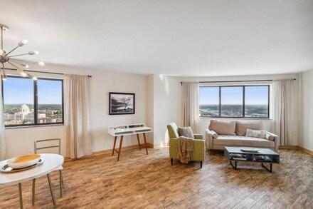 Spectacular panoramic views from a penthouse condo in the Pointe of St Paul. Situated on the 33rd floor. Two bedroom corner unit overlooking the State Capitol and the newly-created Pedro Park! (Google "Friends of Pedro Park" for the plans and progress!) This condo has upgraded lighting, light, newer woodwork and wood-look tile floors throughout the unit. In-unit washer/dryer. The Pointe offers guest parking, indoor swim pool, sauna, workout room, whirlpool, tennis, grilling patio & party room. Good security with on-site staff monitoring & security cameras throughout. Newly-designed Pointe guest suite is $75/night.. Free wi-fi in several common areas. Dues include Heat and AC, water, garage. Electric car charger in the garage. Bike storage. Dog & cats OK: 1 dog & 1 cat OR 2 cats OR 1 dog. #30 dog weight limit. New roof 2019-2020. One block to Pedro Park & restaurants. Blocks to Saints/Twins AAA games. Also, it's only a short walk to the Farmer's Market. Super cute bright condo in an ideal location. Owned garage stall #242 (Level 2).