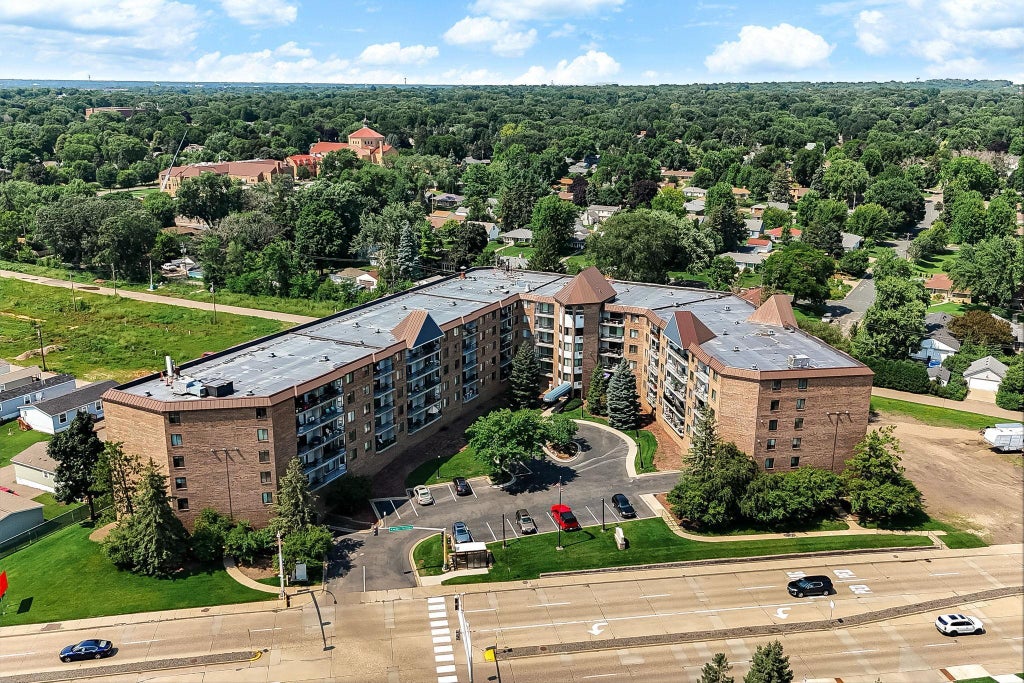 Vibrant Saint Anthony Village 55+ community at Kenzie Terrace offering a fabulous 3rd floor sunny unit! Move right in to this well cared for and updated 2 bedroom, 2 bathroom that has eastern exposure for your morning coffee on the balcony. Open floor plan called the Taft has a center living area flanked with bedrooms and baths at each end. Pretty cool concept! Spacious living room with access to balcony. Formal/informal dining boasts custom full wall buffe with glass upper cabinets, glass backsplash, and “touch the hinge” under cabinet lighting. Try it out! Awesome kitchen loaded with plenty of oak cabinetry and counterspace. Center island for prep or gathering has electrical outlet for crockpots and soft-close cabinetry. 36” upper cabinets, pull-outs, LG electric range, ceramic sink with spot for future water filter, track lighting, and newer flooring. There is plumbing in wall for a dishwasher, if preferred. Owner’s ensuite with private full bath, plenty of closet space, ceiling fan, and wall AC. 2nd bedroom is also spacious and can be a flex room. There is a custom corner desk and full wall cabinet for books and such. (option to have full wall cabinet removed, if desired.) Solid 6 panel oak doors and trim throughout condo. 2nd bathroom is a 3/4 ceramic with updated shower door, faucet, and flooring. Some owners have removed the shower and put in private laundry. A welcoming property and community so close to shopping, restaurants, community theater, and parks! Professional management, strong association, and front desk 24/7 security staff who are so helpful! Garage has separate PID#, stall #49, and is loaded with full wall storage space. Kenzie Terrace offers: free laundry down the hall, along with a private storage unit, gathering areas on each floor by elevators, copier and mail room, guest suites, craft room, fitness center, billiards, woodworking shop, library, and awesome community room with commercial grade kitchen. We would enjoy your visit, so please come on by!