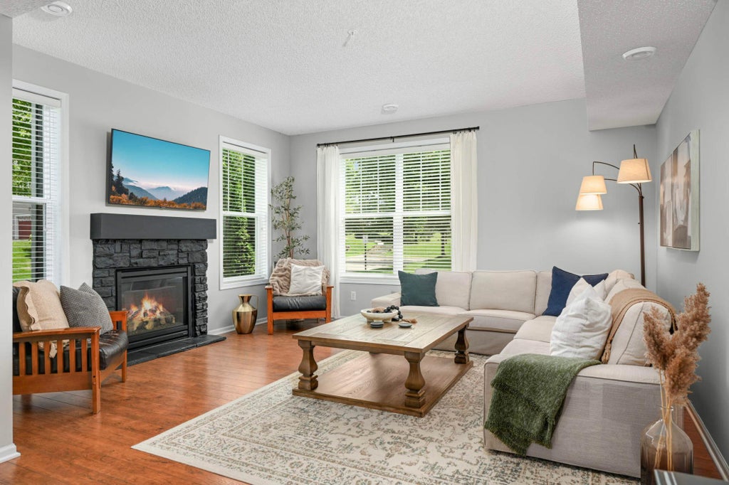 Welcome to this beautifully maintained corner-unit home with the perfect blend of comfort and functionality. The open-concept main level features high ceilings, beautiful LVP floors, and a stone fireplace. The spacious kitchen includes granite countertops, stainless steel appliances, and two large pantries—ideal for everyday living and entertaining. Upstairs, the expansive Primary Bedroom features two separate closets (one is a walk-in) and a large en-suite with dual vanities. An upper-level loft provides versatile space that can be used as a home office, playroom, or extra living room to fit your lifestyle needs. The home includes an insulated two car garage, entry patio, new roof (2024), exterior paint (2025), and driveway apron and sealcoat (2021). Enjoy access to the close-by neighborhood pool and parks, along with adjacent access to scenic trails and the planned development of Avienda, a shopping and lifestyle destination. The community is well managed by the association, ensuring year-round landscaping, timely snow removal, and exterior care. Come see this sun-filled home and make it yours!