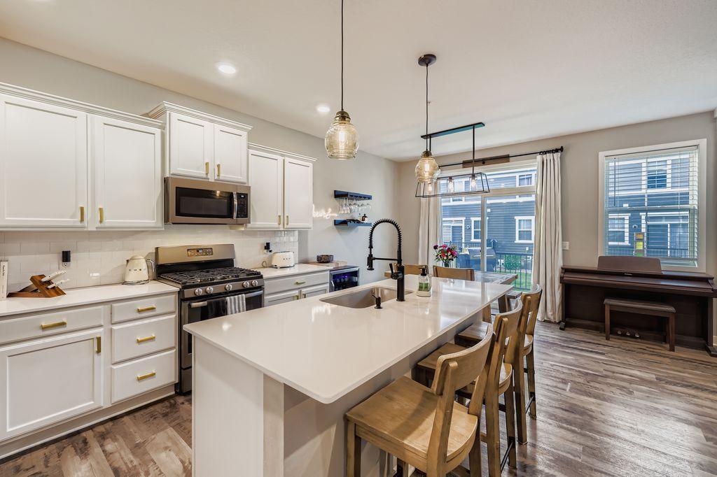 Welcome home to this stunning Avonlea townhome, where modern elegance and maintenance-free living meet. A spacious foyer greets you and opens into a bright, open-concept floor plan perfect for both relaxing and entertaining. The living room is the heart of the home, featuring a stylish shiplapped fireplace and a decorative accent wall. The gourmet kitchen boasts a massive island with seating for three, complemented by modern stone countertops and sophisticated white cabinetry with gold fixtures. The adjacent dining area provides seamless access to the deck, ideal for enjoying outdoor meals. A chic half-bath with on-trend wallpaper completes the main level. Upstairs, you'll find three generously sized bedrooms. The primary suite is a private retreat, offering a huge walk-in closet and an ensuite bathroom with an expansive walk-in shower and tasteful accent wallpaper. For ultimate convenience, the laundry room is located on the same upper level as the bedrooms.The unfinished lower level presents a fantastic opportunity to build equity and customize additional living space to your needs. This home is nestled within the Avonlea community, which provides a maintenance-free lifestyle and numerous outdoor recreational opportunities. Its prime location just off Cedar Avenue offers easy access to nearby shops, restaurants, schools, and parks. Don't miss this opportunity—schedule your private tour today!