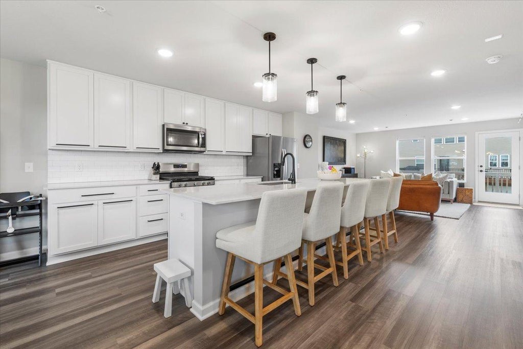 This modern end-unit townhouse offers style, comfort, and convenience in every detail. Upstairs, you’ll find three spacious bedrooms located side by side, including a luxurious primary suite featuring a walk-in closet and a thoughtfully designed private bathroom. The laundry closet is conveniently located just steps from all the bedrooms, making daily routines a breeze. The main level boasts an open-concept layout centered around a show-stopping 10-foot island with seating for gatherings, plus a separate dining area and an inviting living room. A bathroom is conveniently located on every level of the home. On the ground level, the welcoming family room offers endless possibilities—it can be enjoyed as a second living space, converted into a fourth bedroom, or transformed into the perfect home gym or office. The choice is yours! Enjoy the lifestyle this community offers, with multiple paths that lead directly to the playground, as well as a patio area with a cozy fire pit—perfect for relaxing evenings or gathering with neighbors. This end unit also offers a fabulous side yard for pets or children to enjoy!