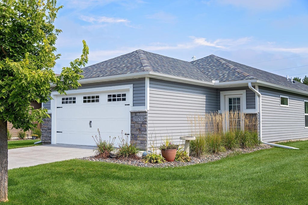 Beautiful 2 bed, 1 bath single-family home offering one-level living with no interior or exterior steps. Large entryway, open floor plan with vaulted ceilings, large breakfast bar/island, walk-in kitchen pantry and stainless steel appliances. Bathroom features a walk-in shower and double sink vanity. Attached 2-car garage. Extras include laundry room, rain gutters, in-ground sprinklers, and back patio for outdoor enjoyment. HOA covers lawn care and snow removal. Conveniently located near shopping, I-35 for easy commuting, playground, and walking paths.